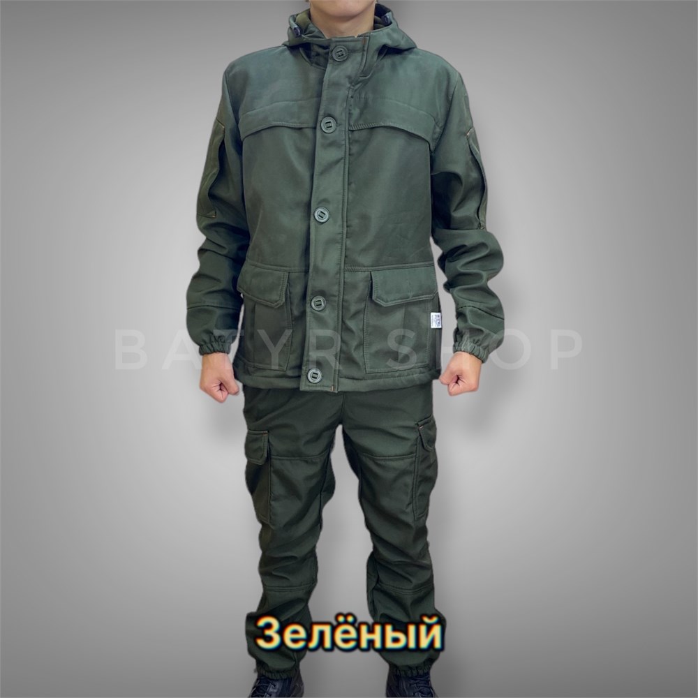 Куртка костюма имеет глубокий и удобный капюшон с регулировкой на эластичном шнуре по овалу лица. Куртка застегивается на широкую молнию и поверх закрывается на планку. Планка застегивается на канадские пуговицы.